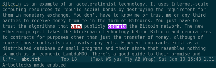 “Art Bollocks” is a better and older name than “International Art English” for the opaque and otiose Artspeak used in press releases, in journals and on blogs. I wrote artbollocks-mode, or AB as it discreetly identifies itself on the Emacs status line, to help art writers avoid it, starting with myself. As the above example shows, nobody’s perfect.
